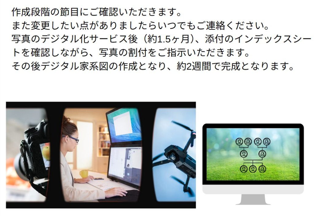 私たちが提供するクラウド型デジタルアーカイブサービス【ファミリーヒストリー】は、写真や資料の整理・デジタル化・クラウド保存まで、全てワンストップで解決できます。あなたはただ、私たちに「思い出の品」を預けるだけでOK!面倒な作業はすべて私たちが行います。